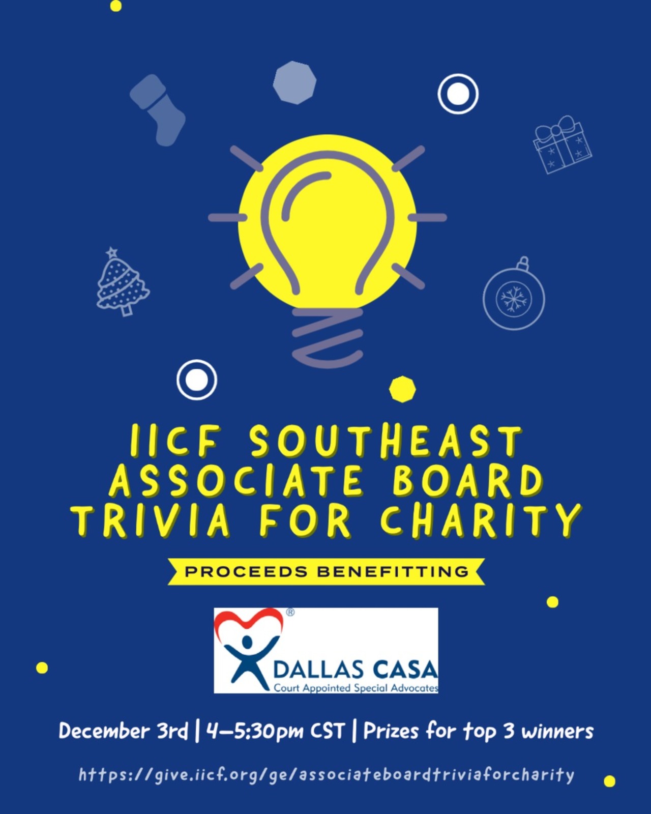 The IICF Southeast Associate Board invites you for an afternoon of virtual trivia! Grab a beverage and showcase your trivia talent all while raising much needed funds for Dallas CASA's Christmas Angel Tree Program! For every $50 raised, a child's Christmas dreams will come true this holiday season with presents under the tree!Dallas CASA advocates in the community and the courtroom for children in the protective care of the state so they can grow up in safe, permanent homes where they can thrive. This year, they expect nearly 2,200 Angel Tree requests for children in foster care.Thank you for joining us to continue IICF's mission during this unprecedented time as #insurancegivesback!Game will be hosted via Zoom(link to come before game begins)Sponsorship opportunities are availablefrom $500 to $2,500Individual tickets are available for $25 eachThis is an individual game, but we encourage you to play with your family, roommate or friends in your household!