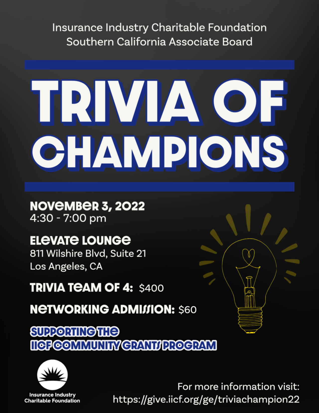IICF Trivia of ChampionsThe IICF Southern California Associate Board invites you to gather your colleagues, clients, and friends for the in-person return of Trivia of Champions. Bragging rights are on the line! Are you and your colleagues ready to show off your general knowledge and trivia prowess.New Date!November 3, 20224:30 pmĀ - Check in5:00 pm - TriviaTeam Admission: $400Networking Admission: $60